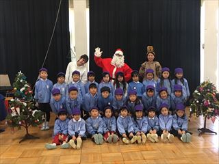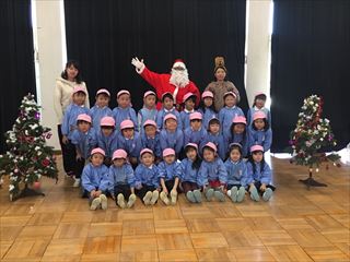 ひかり幼稚園もこの日はクリスマス会!ホールも飾り付けやツリーが置いてありました☆先生サンタが現れて手遊びやペープサートを見ましたよ♪