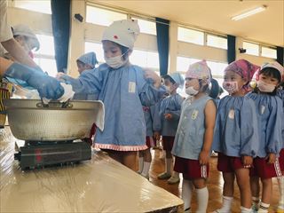 今回年長さんは青・桃がお野菜を切って、紫・赤が大きいお鍋で炒める担当をしました。