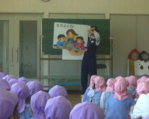 月曜日は、大阪府警の方が来られ、知らない人についていかない為の安全教室がありました。