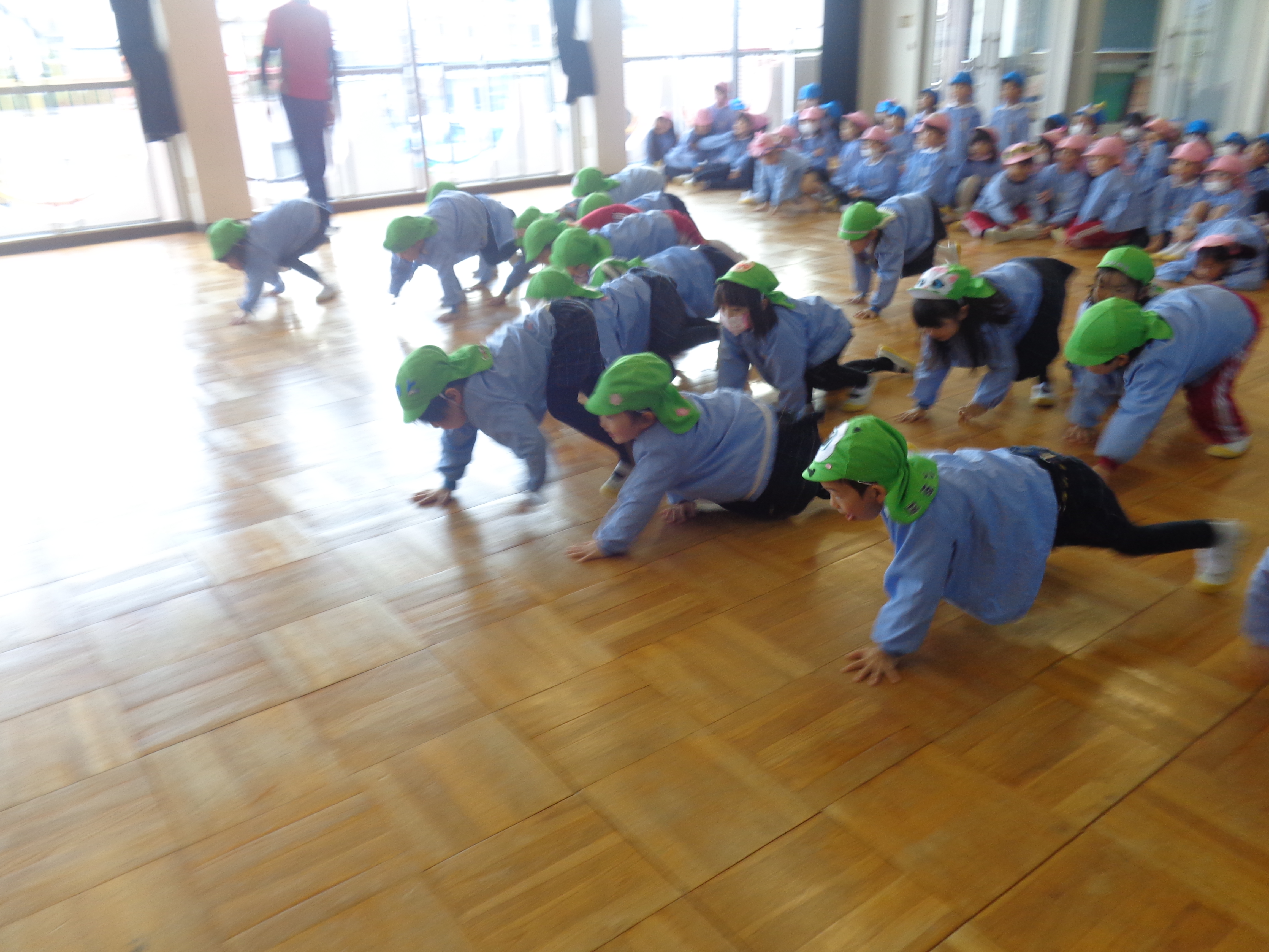 そして身体をしっかり動かせるよう、ワニになったりウサギになったりと、楽しみながら身体を動かしました!