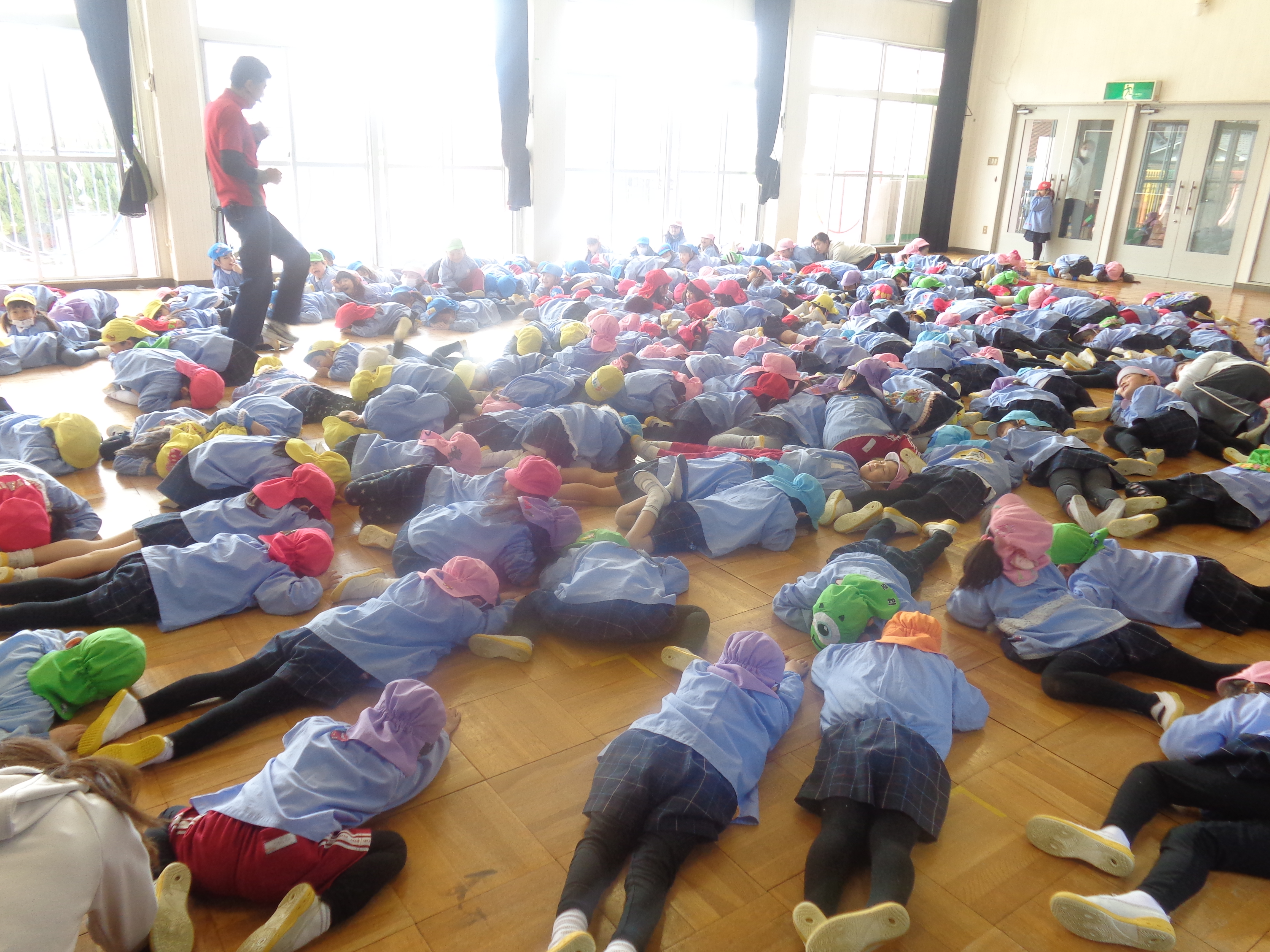 ある〜ひ♪と歌いながらホールをぐるぐる歩き、「熊だーーーー!」と聞こえると寝たふりをします。