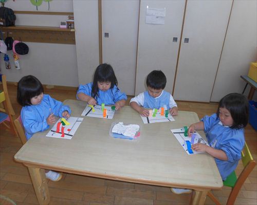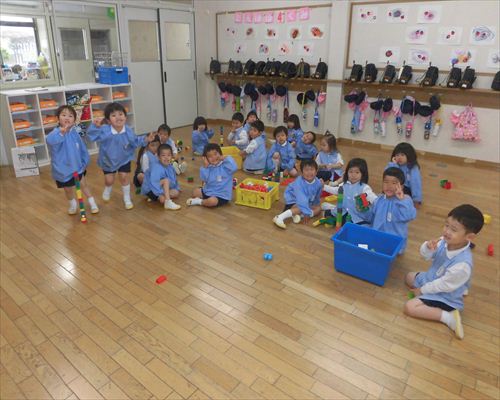 朝ーお部屋に入るとタオルやコップ、お帳面を出して園内着に着替えてオモチャであそびまーす!
