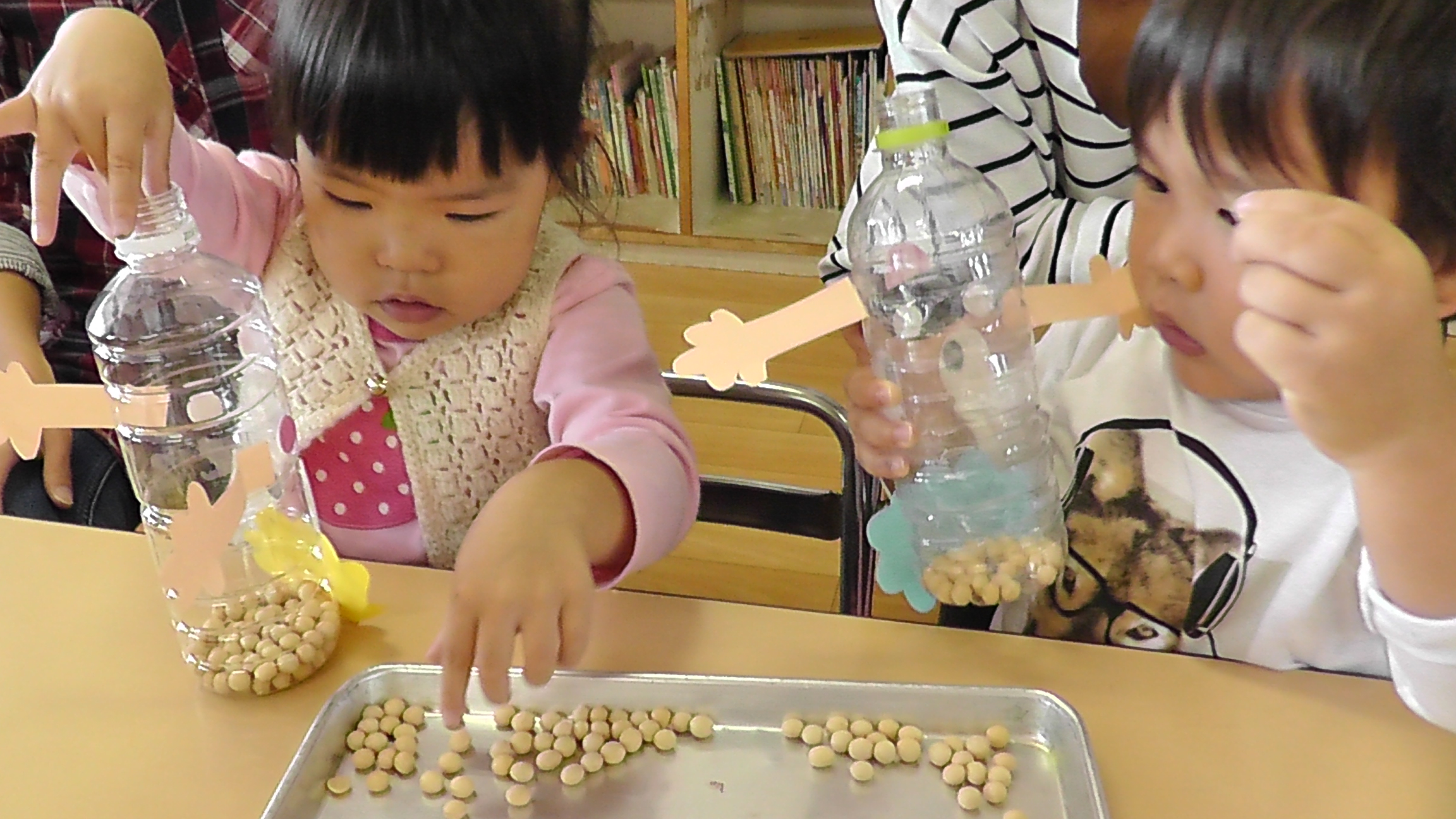 ペットボトルに顔等のシールを貼り、最後にはお豆を一つずつ掴んでいれていきました☆