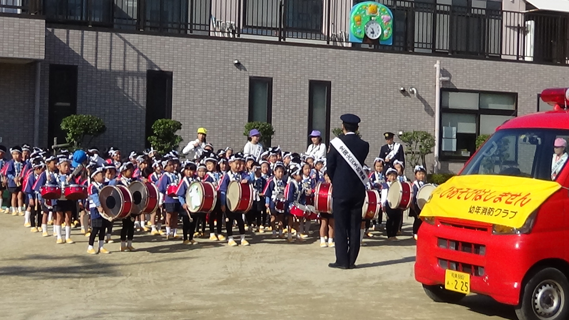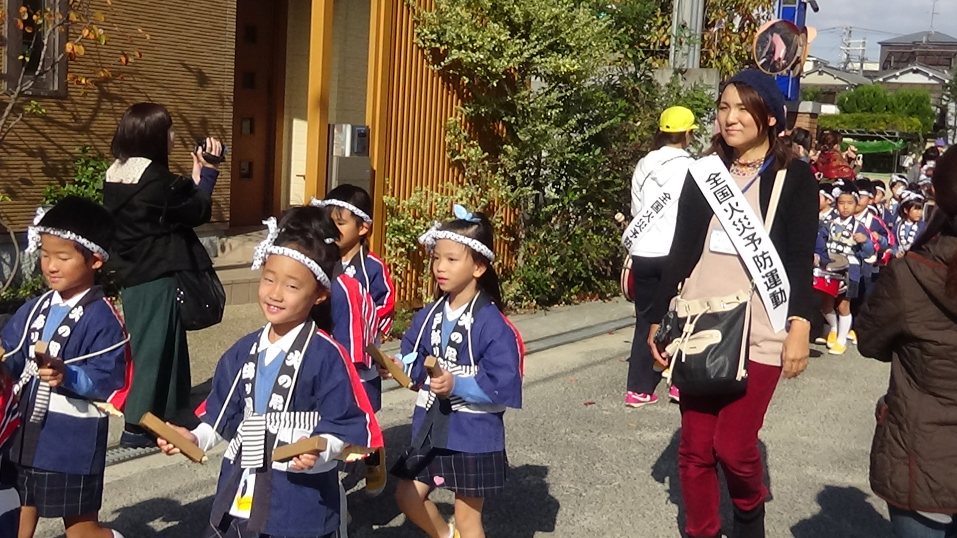 幼年消防クラブのはっぴを着て、拍子木や太鼓をたたいて